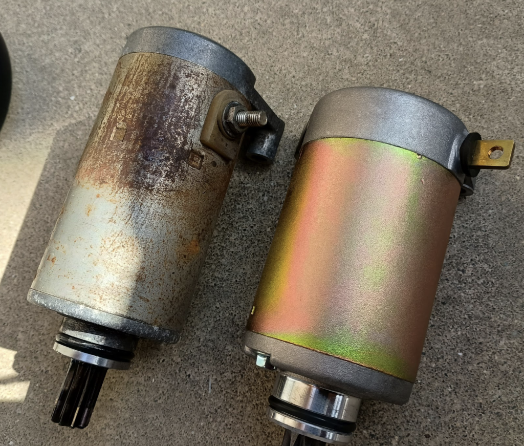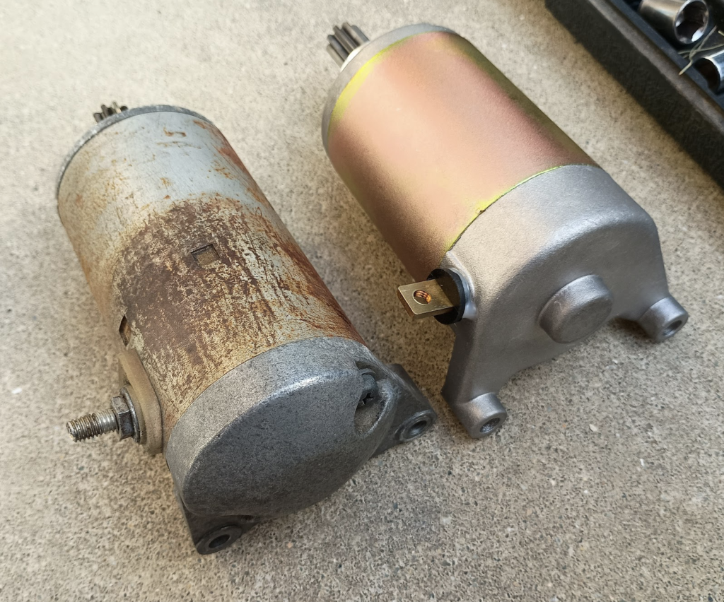 新旧比較。元々付いていたセルモーターはかなり年季が入っています。