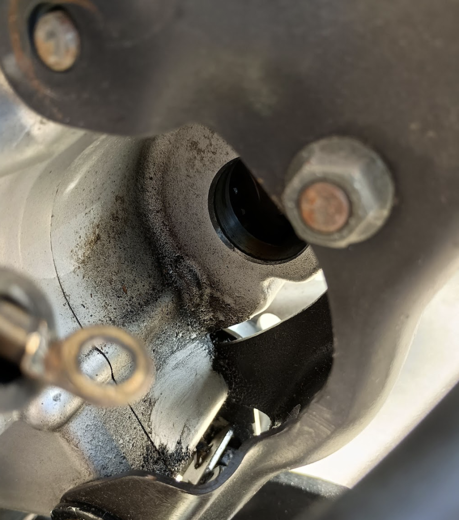 走行した後に、エンジンの前方からオイルが漏れているなぁと思っていたのですが、どうやらココからエンジンオイルが漏れていたようです。拭き取ってみると、オイルと汚れが混じったものがべっとりと付いていました。。。