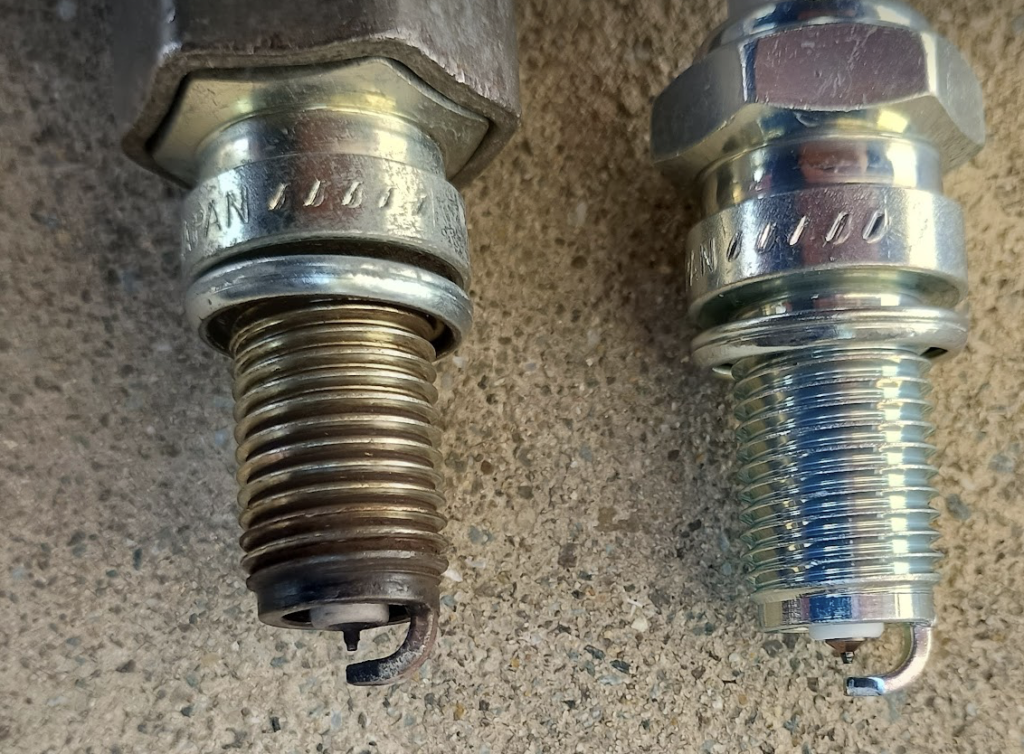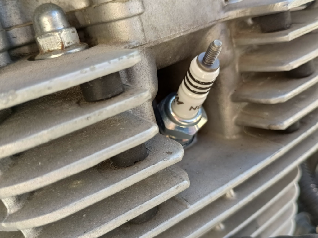 バッテリーを満充電してから再トライするもやはりエンジンはかからず。。。プラグを外してみると、結構カブってしまっていて、電極の汚れもひどそうなので、交換することにしました。