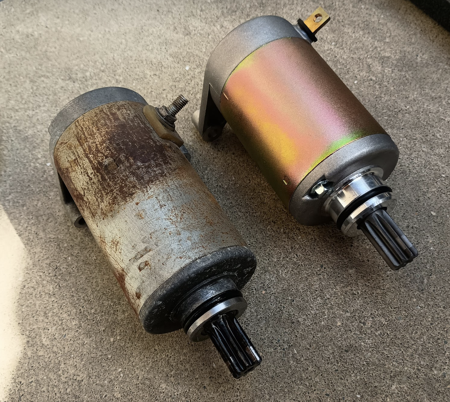新旧比較。元々付いていたセルモーターはかなり年季が入っています。
